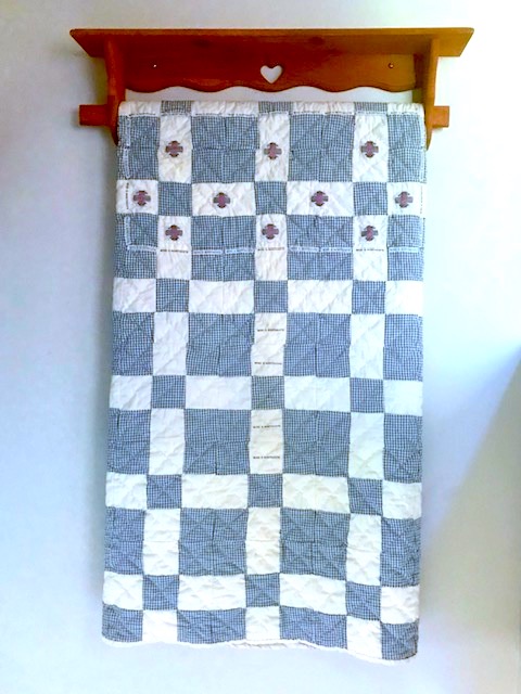 Dot the center of the quilt with my school’s logo patches. Border them with my embroidered nametags. Someday, I’ll take a new last name, just as you did when, a widow with a five-year-old, you married a man so different from my father. This new husband, not sickened by alcohol, adopted me, gave me this name on the quilt.