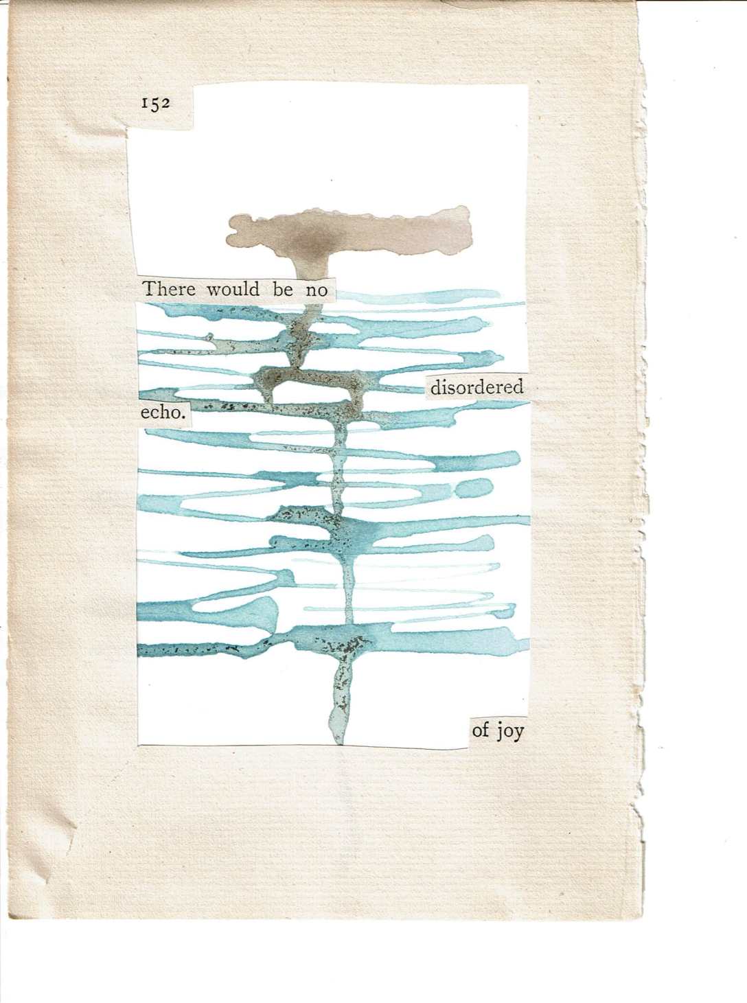 Image description: visual poem reads “There would be no // disordered / echo. // of joy.” The words appear cut from an old book page, with 152 in the top right corner. Behind the words is a white piece of paper with brown and blue ink strokes zig-zagging horizontally and dripping vertically.
