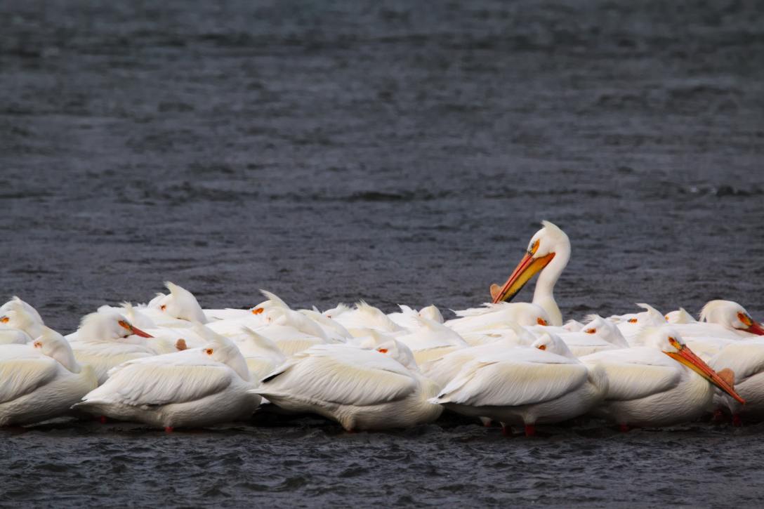 Image description: white birds gathered on gray water.