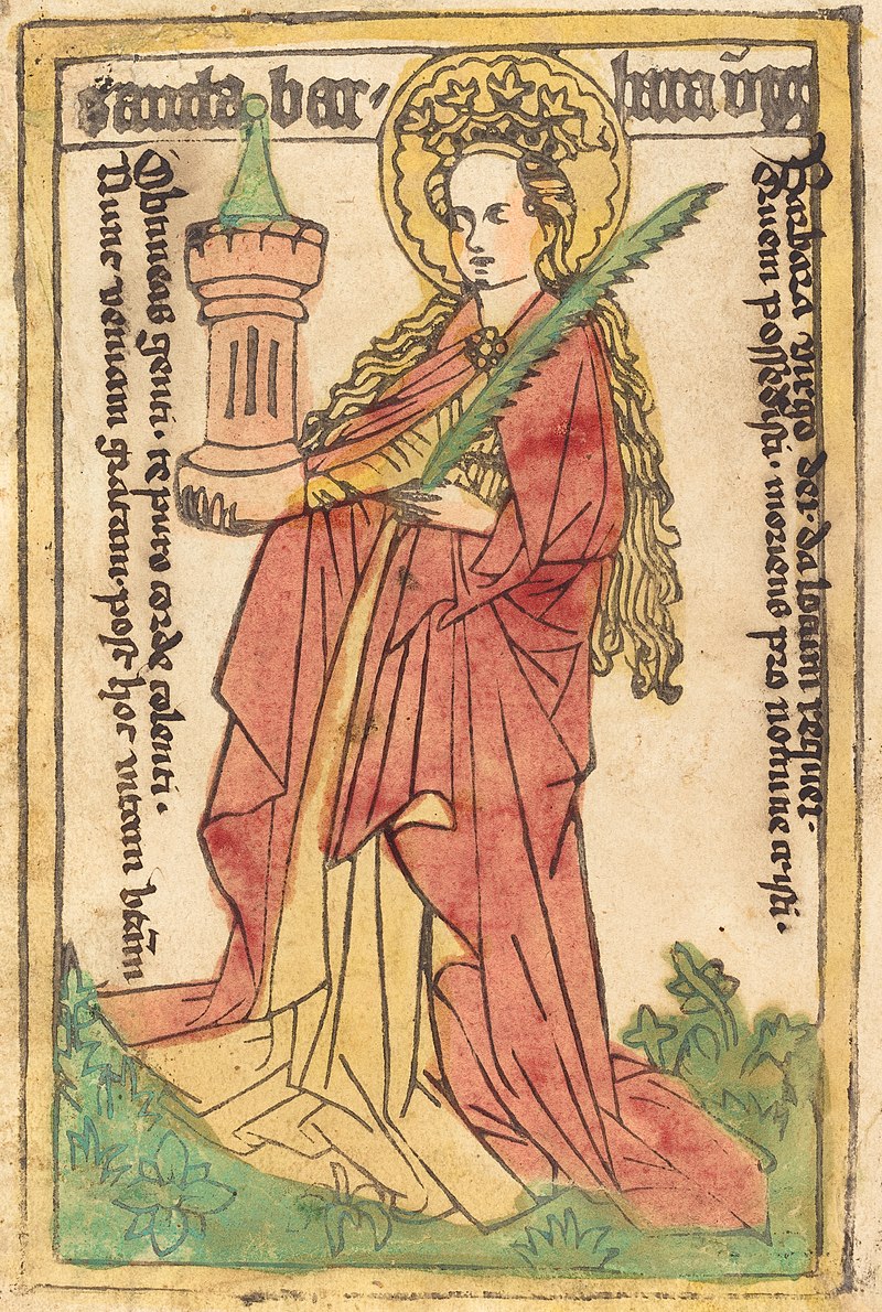 Image description: a woodcut of Saint Barbara holding a feather and a tower. She has a golden halo and text surrounds the top and sides of the image.