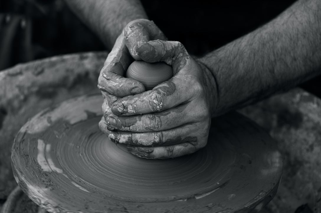 Image description: Hands covered in clay on a pottery wheel in grayscale.
