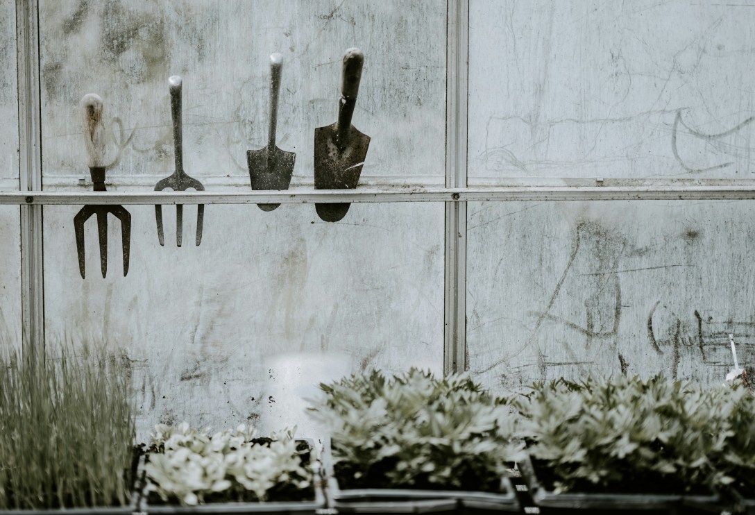 ID: Garden tools against a cloudy greenhouse wall.